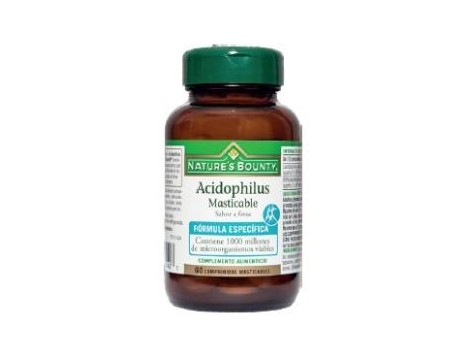 Acidophilous with Bífidos tablets. Prepared food-based probiotics. Ingredients: 1000 million in guaranteed micro-fabrication. Natural strawberry flavor. Without milk. Presentation: Bottle of 100 tablets.