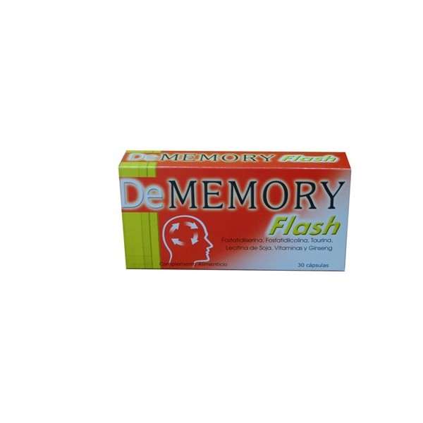 DeMemory Flash Preparado alimenticio complementario formulado a base de fosfatidiserina, fosfatidilcolina, taurina, ginseng, lecitina de soja. INGREDIENTES: LECITINA DE SOJA, FOSFATIDILCOLINA, FOSFATILDISERINA, EXTRACTO DE GINSENG, L-TAURINA, FOSFATO BICÁLCICO, OXIDO DE ZINC, MANGANESO SULFATO, VITAMINAS: A, GRUPO B ( B1, B2, B3, B5, B6, B7, B9, B12), C y E MODO DE EMPLEO: Se recomienda tomar dos cápsulas diarias, preferentemente antes del desayuno. PRECAUCIONES Y ADVERTENCIAS: Los complementos alimenticios no deben utilizarse como sustitutos de una dieta alimenticia equilibrada. Mantener el producto en lugar fresco, seco y lejos del alcance de los niños PRESENTACIÓN: 30 cápsulas de 782 mgrs