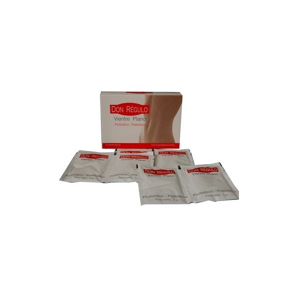 Don Regulo VIENTRE PLANO Sobres Es un complemento alimenticio preparado a base de Fructooligosacáridos y Probióticos que junto con los demás componentes de la fórmula ayudan a mantener el vientre plano Ingredientes destacado: Fructooligosacáridos, Anís aroma, Streptococcus thermophilus, Lactobacillus casei, Lactobacillus acidophilus, Lactobacillus bulgaricus, Bifidobacterium bifidum, Bifidobacterium longum, Latobacillus rhamnosus, Aspartame (E-951) Concentración en fermentos de 2 x 108 Modo de empleo: Tomar un sobre al día diluido en agua o zumos. Para su correcta disolución es conveniente verter primero el contenido del sobre y añadir agua poco a poco, removiendo hasta la disolución completa del polvo. ADVERTENCIAS y PRECAUCIONES: Los complementos alimenticios no deben usarse como sustitutos de una dieta equilibrada. Edulcorante aspartame. No apto para fenilcetonúricos. Ingesta máxima diaria de Aspartame: 40 mg/kg de peso corporal. Contenido en este producto: 3 mg por sobre. Conservar en ambiente fresco y seco. Mantener el producto fuera de alcance de los niños