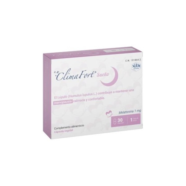 Climafort Sueño contém lúpulo, erva-cidreira e melatonina, ingredientes que podem ajudar nos sintomas da menopausa, como irritabilidade e alterações de humor. Além disso, a sua fórmula melhorada com erva-cidreira e melatonina contribui positivamente para o descanso nocturno, tornando-se um suporte para quem sofre de problemas de sono. O lúpulo ajuda a manter os níveis normais de estrogênio no corpo, o que pode ser útil nas ondas de calor noturnas e outros sintomas associados. Outro ingrediente importante da fórmula do Clima Fort é a erva-cidreira, erva que tem sido utilizada por suas propriedades calmantes e sedativas. A erva-cidreira pode ajudar a manter a qualidade normal do sono e uma sensação geral de bem-estar.