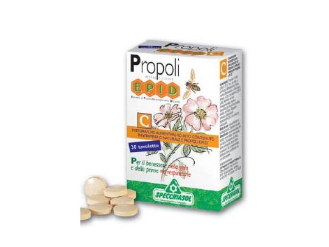 EPID C COMPRIMIDOS MASTICABLES (PROPOLEO, SISTEMA INMUNITARIO, CATARROS, RESFRIADOS, GRIPES, BALSAMICO...). DESCRIPCIÓN: Comprimidos masticables con alto contenido de propóleo EPID® y con Rosa canina, como aporte de vitamina C. Esta formulación, además de por las conocidas propiedades del propóleo, se recomienda especialmente a las personas que, por sus particulares condiciones fisiológicas, necesitan un mayor aporte de vitamina C, tales como los fumadores, los ancianos, los adolescentes, o las mujeres durante la gestación y la lactancia. El propolis es un producto de la colmena constituido por resinas, bálsamos, gomas vegetales, ceras y otras sustancias elaboradas por las abejas. Las conocidas propiedades del propóleo han hecho que el hombre lo utilice para su bienestar. La literatura científica lo propone como “antibiótico natural” por excelencia. Specchiasol ha desarrollado un método exclusivo y patentado de extracción de los principios activos del propóleo: el método E.P.I.D. (extracto de propóleo hidrodispersable sin cera). Specchiasol, tras años de investigación en el ámbito universitario, ha logrado desarrollar, en su moderno complejo industrial dotado con un sofisticado y equipadísimo laboratorio farmacéutico homeopático, un método exclusivo y patentado de extracción del propóleo. Extracción selectiva en frío y con solventes naturales: el producto que se obtiene es un extracto purificado sin ceras y sin otras sustancias contaminantes, que conserva todos los principios activos del propóleo, que lo convierte en un própoleo altamente biodisponible. EL PROCEDIMIENTO DE EXTRACCIÓN DEL PROPOLEO E.P.I.D. TIENE CARACTERISTICAS QUE HACEN QUE SEA ÚNICO: ?Utilización de un especial derivado amiláceo que permite la formación de una película protectora muy delgada (el E.P.I.D. elaborado posee, por lo tanto, una enorme concentración de principios activos). ?Alto grado de atomización del extracto útil que favorece la máxima absorción. ?Estabilización de los principios activos del propóleo, que, gracias al encapsulado, no entra en contacto con el aire. ?Fácil aprovechamiento de los principios activos debido a la solubilidad del polvo en el agua. La línea E.P.I.D. abarca una amplia gama de productos utilizables tanto por vía interna como por vía externa. Su formulación es el resultado de muchos estudios y experimentaciones. Se ha encontrado, de esta forma, la concentración óptima de propóleo útil para una máxima eficacia. Además, la estandarización de la cantidad de propóleo en los diferentes productos y la garantía de una titulación cuidadosa, permiten una real constancia en los resultados. El Propóleo E.P.I.D. está titulado al 2,5% de flavonoides. EXTRACCIÓN SELECTIVA EN FRÍO Y CON SOLVENTES NATURALES. El extracto líquido de propóleo adquiere un color dorado y puede utilizarse como tal o bien deshidratado por atomización en presencia de maltodextrinas (procedimiento spraydryer): el propóleo microencapsulado se presenta como polvo impalpable con el característico aroma, sin ceras, aislado del contacto con el aire, de los agentes oxidantes y, por lo tanto, estable en el tiempo. INGREDIENTES: Extracto seco de Própoleo E.P.I.D., Rosa Canina frutos e.s. Propóleo sin cera y purificado EPID: 65,0 g (Por 100 g); 1690 mg (Por toma diaria (2 cpr)). Rosa canina frutos e.s.: 6,43 g (Por 100 g); 170 mg (Por toma diaria (2 cpr)). Aporte total de vitamina C: 4,50 g (Por 100 g); 120 mg (200% RDA) (Por toma diaria (2 cpr)). MODO DE EMPLEO: Tomar 2 o más comprimidos masticables al día. PRESENTACIÓN: 30 comprimidos.